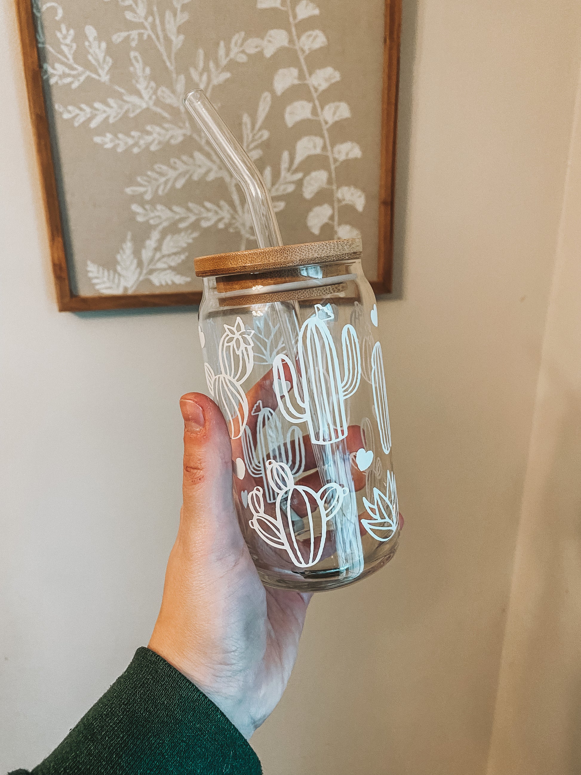 This cactus glass tumbler is perfect for iced coffee or your favorite cold drink. High quality vinyl is used for this design on the 16 oz glass beer can style cup. This glass comes with a bamboo lid and a reusable glass straw.