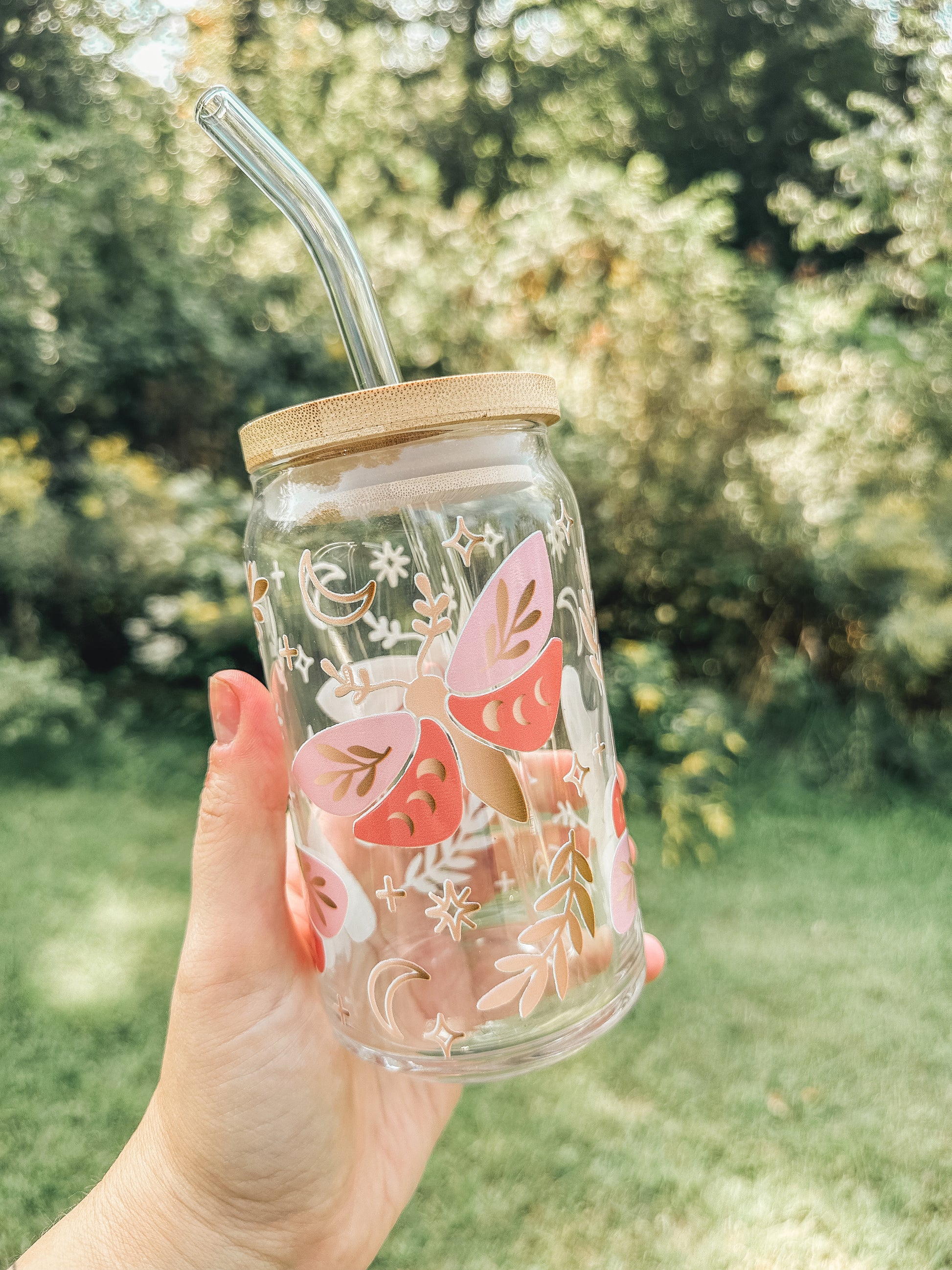 This trendy glass is the perfect vibe for the cooler weather! The glass pictured below is 16oz. All of our cups are made with permanent uv decals and come with a bamboo lid & reusable glass straw. All glasses are handwash only and come with care instructions in each package!