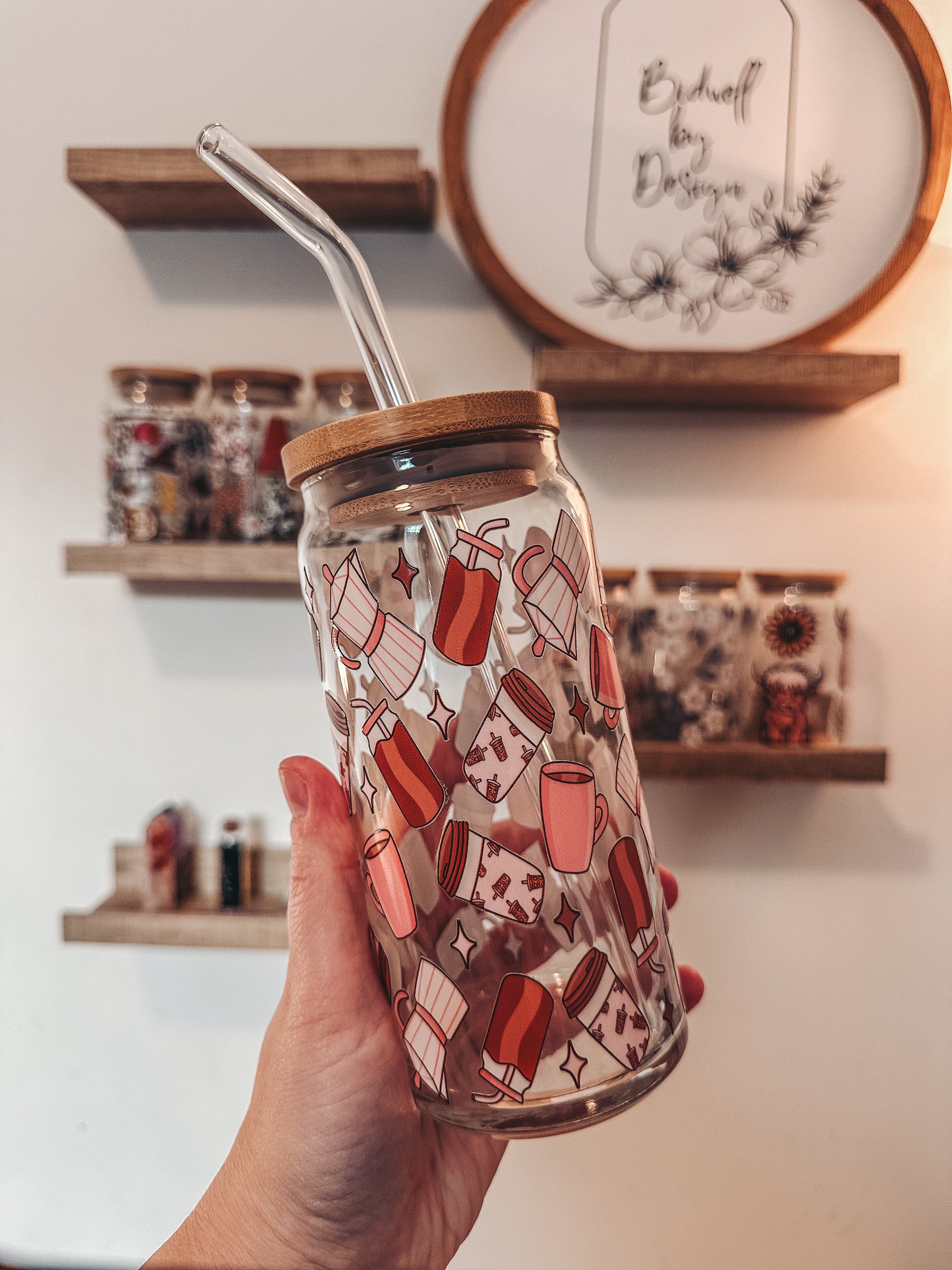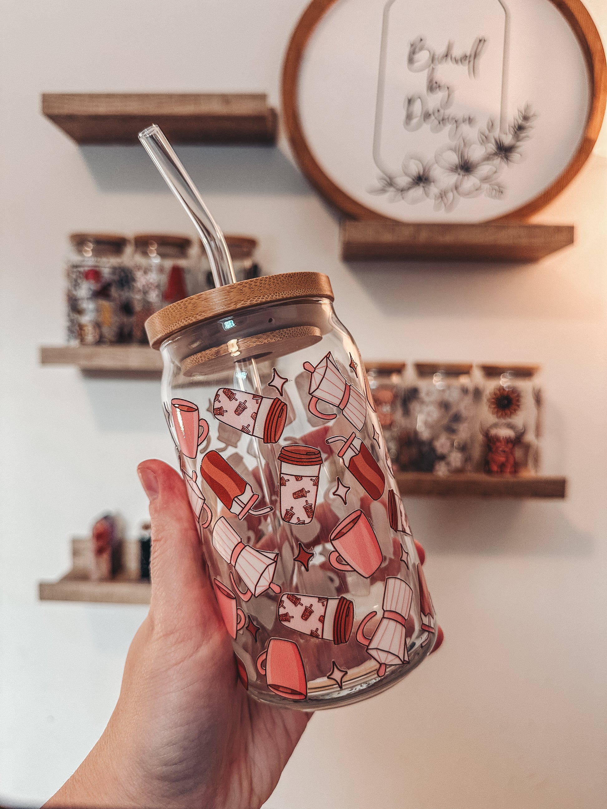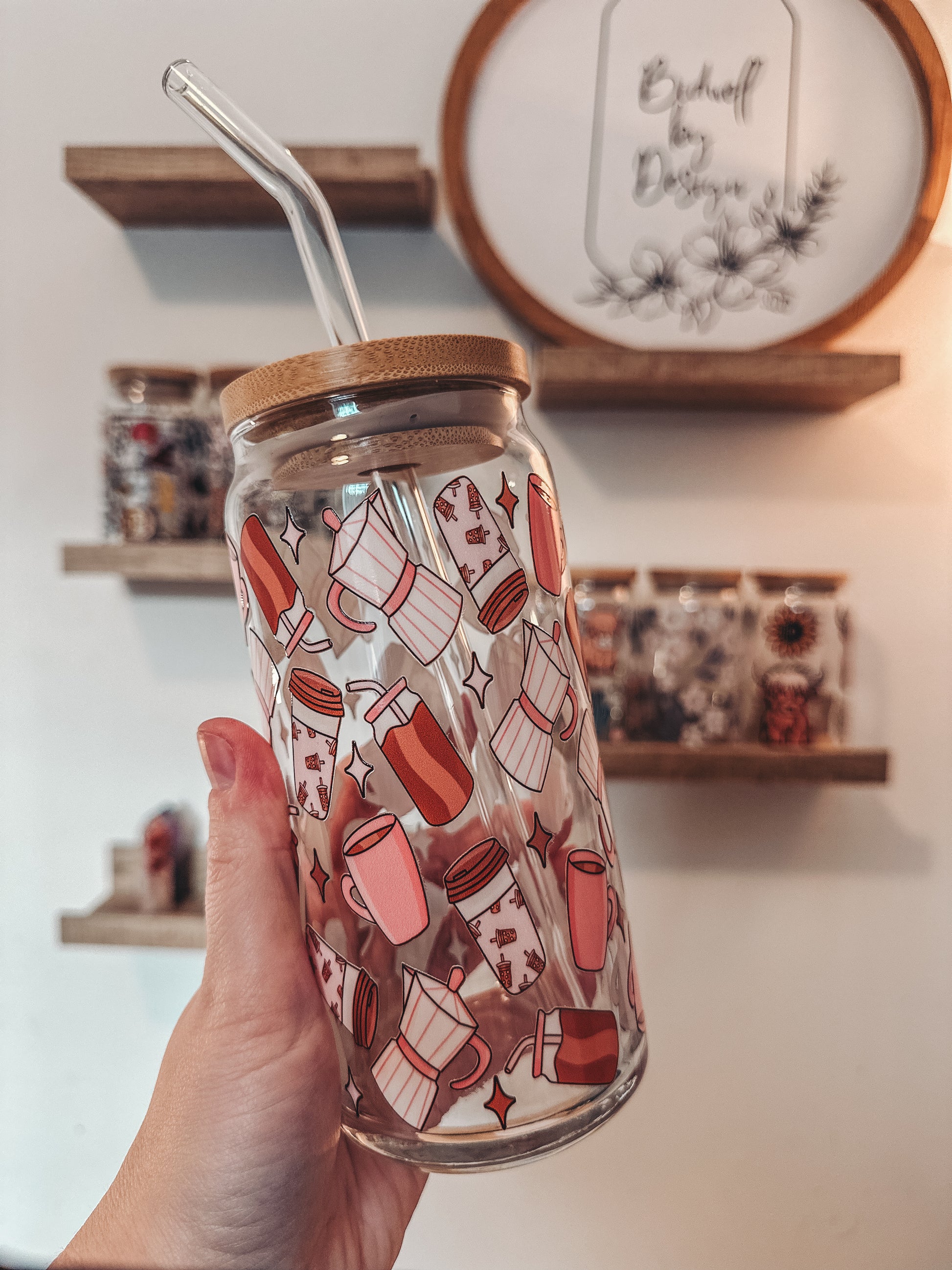 The glass pictured below is 16oz or 20oz. All of our cups are made with permanent uv decals and come with a bamboo lid & reusable glass straw. All glasses are handwash only and come with care instructions in each package!