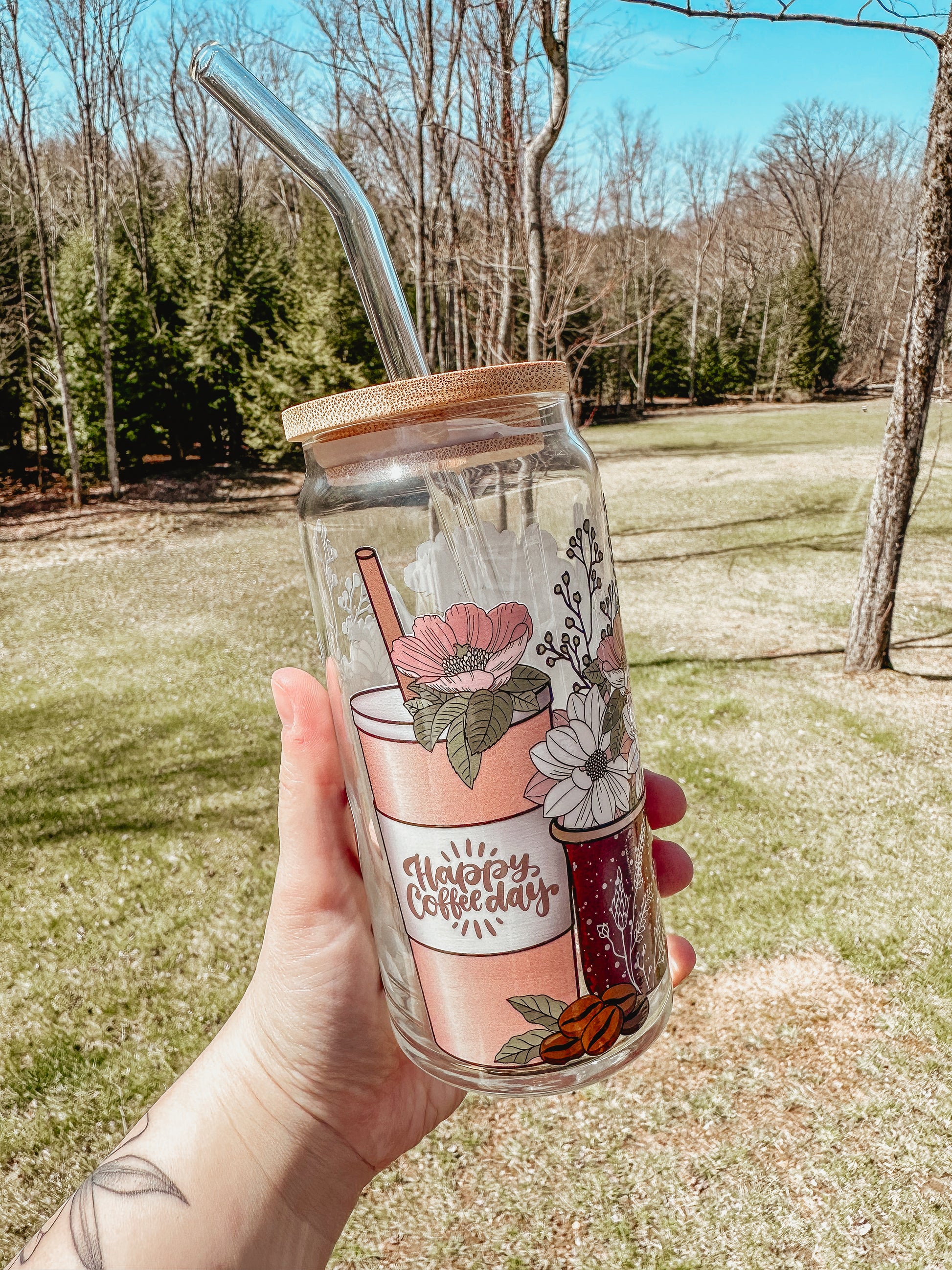 This trendy glass is the perfect vibe for coffee lovers! The glass pictured below is 20oz. All of our cups are made with permanent uv decals and come with a bamboo lid & reusable glass straw. All glasses are handwash only and come with care instructions in each package!
