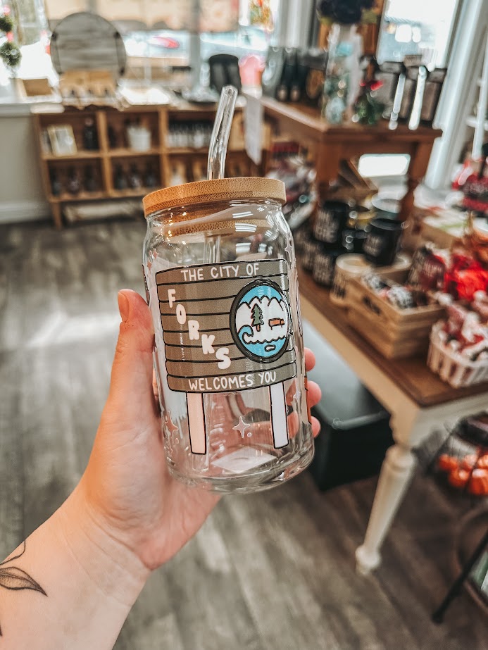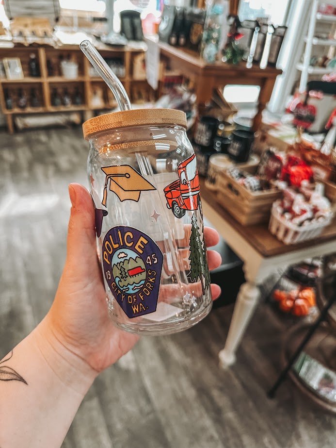 The glass pictured below comes as a 16oz or 20oz. All of our cups are made with permanent uv decals and come with a bamboo lid & reusable glass straw. All glasses are handwash only and come with care instructions in each package!